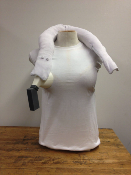 3. She wraps the XX pump around her neck, and unbuttons her shirt.
